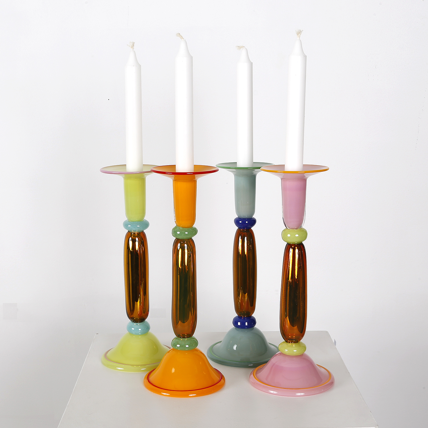 Bilden ovan visar en samling av ljusstaken Spegling gjord av glasblåsaren Jonas Rooth. Ljusstaken är inspirerad av fasaden på Sven-Harrys Konstmuseum.